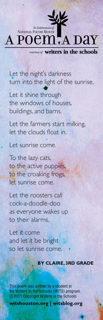 National Poetry Month begins today, April 1st, 2011. At Writers in the Schools (WITS) we send out an email with a child’s poem every day for the month. Find out about that and other poetry offerings here.