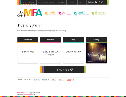 Every writer gets stuck on occasion. When that happens, there’s hope. Check out the Writer Igniter app on the DIY MFA website. The program shuffles an e-deck of cards and provides you with a character, a situation, a prop, and a setting. You take it from there, imagination not included!