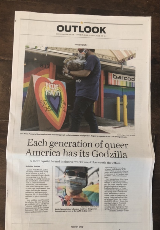 The Houston Chronicle published my essay on Pride month, discrimination, and there’s even a Godzilla poem included for good measure. It appears on the front page of the Sunday paper (6.6.21). In the article I share some of my personal experiences and try to assess how much the LGBTQ+ community has progressed in my lifetime and the work we still have ahead of us. If you cannot access it through this link, try using this download link instead: