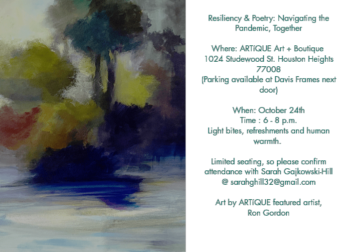 On Sunday, October 24th, there will be a Houston reading on the theme of resilliency. Curated by Sarah Gajkowski-Hill, this 6 pm event will be for community and healing. I am honored to participate in this reading; it will take place at Artique (1024 Studewood). Please RSVP to Sarah because space is limited.
