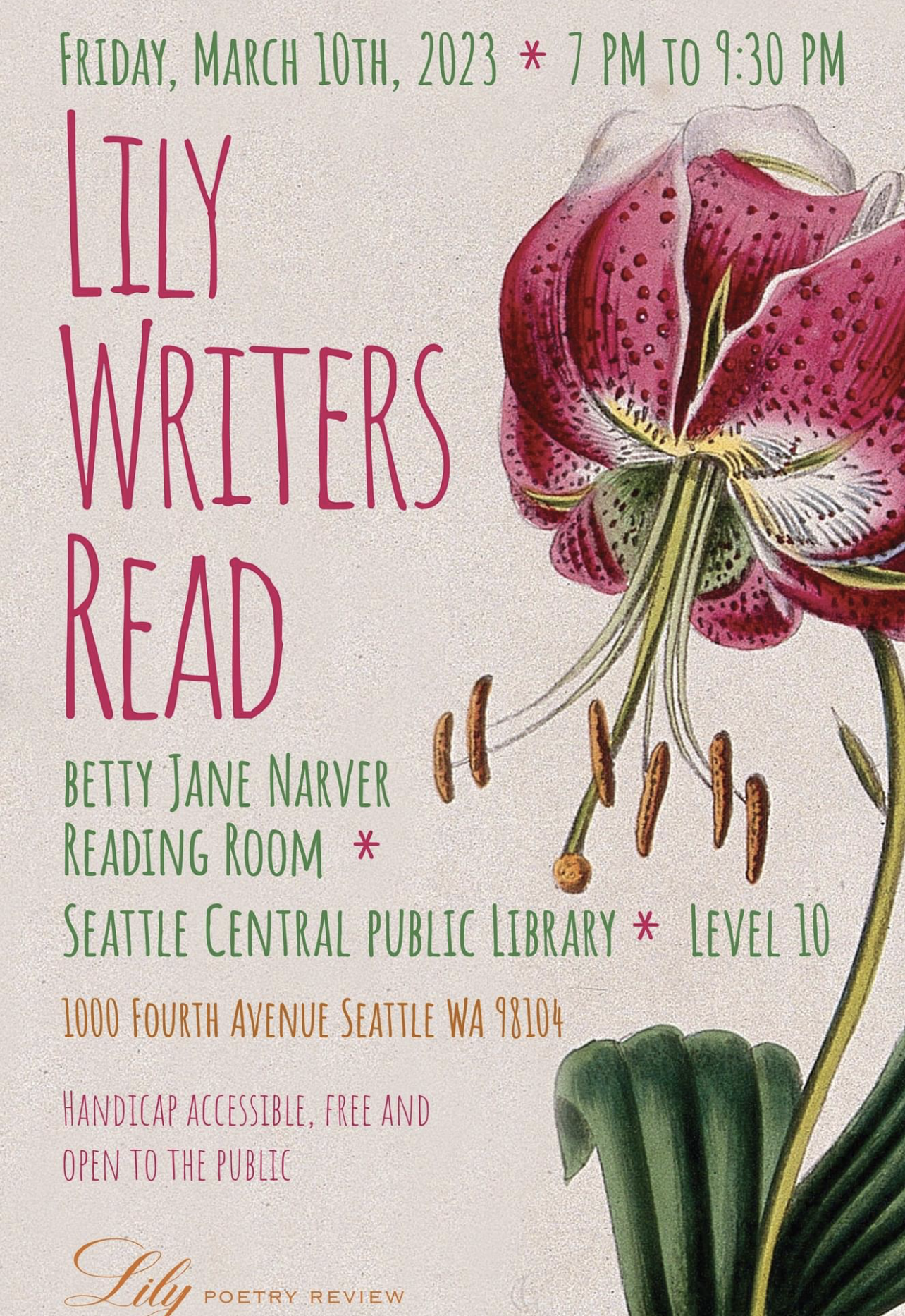 I’ll be reading with Lily Poets at #AWP23 in Seattle on Friday night, March 10th. The reading will be held on the 10th floor in the Betty Jane Narver Reading Room. It’s a free even, and you’re invited!