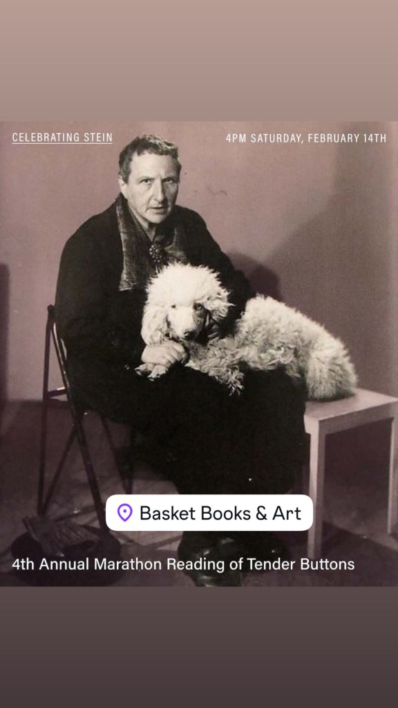 this Valentine’s Day. Yes, Basket Books and Art will host its 4th annual marathon reading of “Tender Buttons” on Saturday, February 14th at 4 pm.