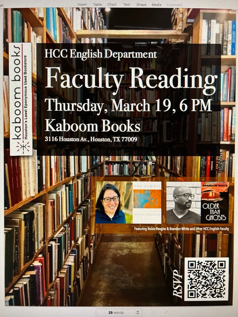 On Saturday, April 17th, at 2 pm, I will be one of ten poets celebrating Public Poetry’s 10th anniversary. The event is co-sponsored by the Houston Public Library. The zoom link will be available from either sponsor on FaceBook.